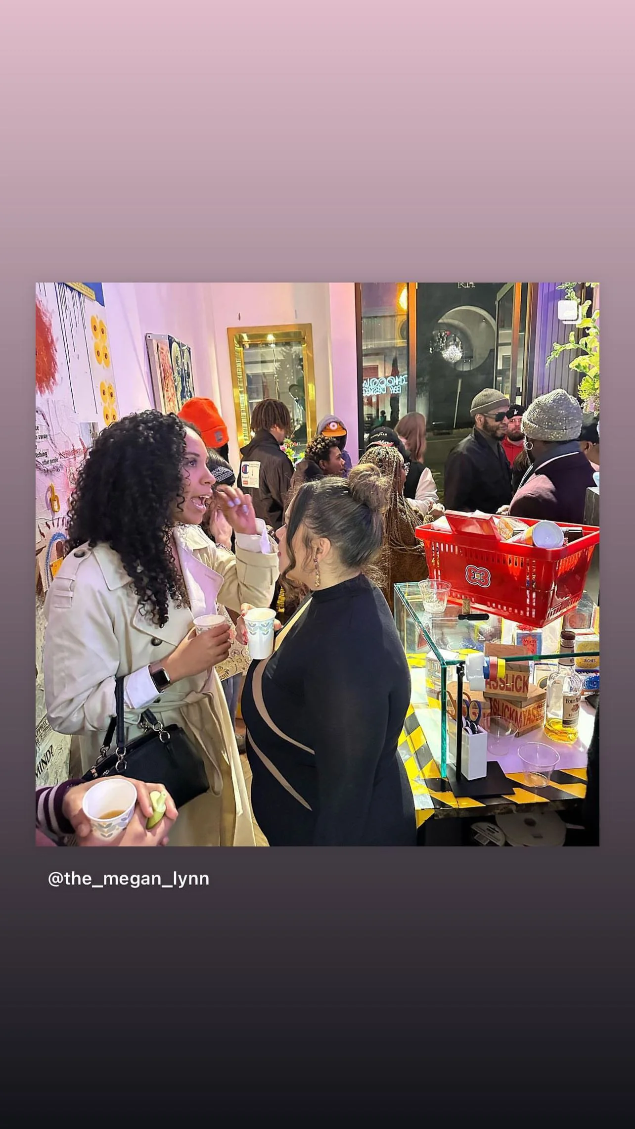 Tricky Stewart and Mr. Wattson posing in front of an artwork at an art gallery. One is wearing a pink hat, colorful jacket, and sunglasses, while the other is dressed in a black shirt, a patterned scarf, and sunglasses, holding shopping bags. View fullsize
