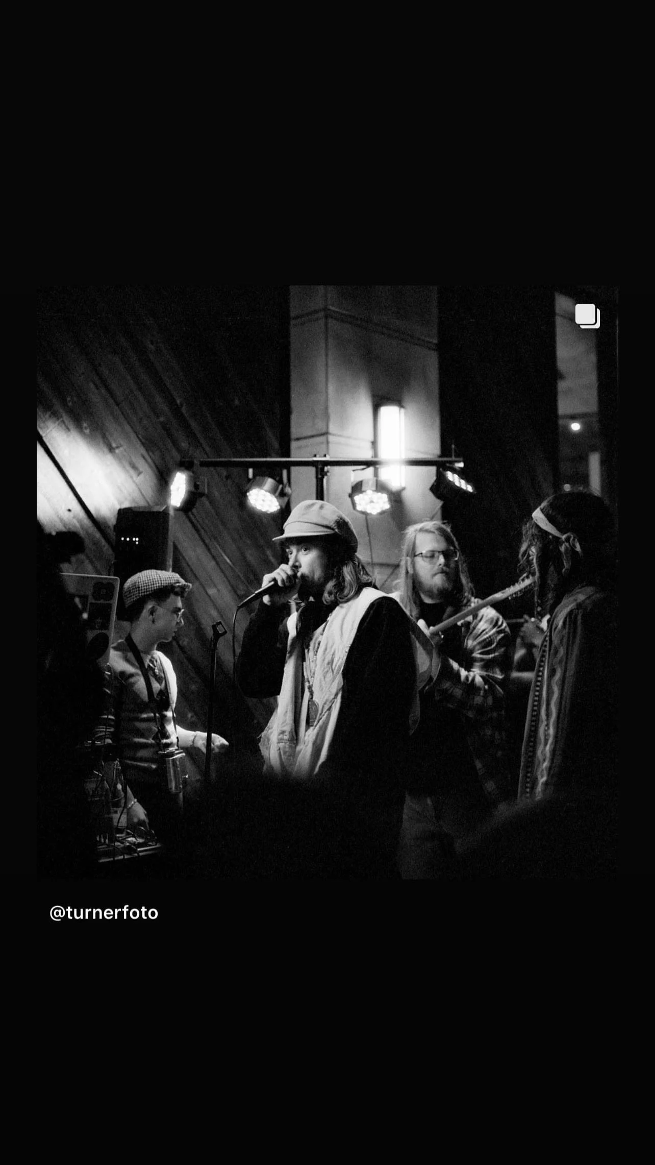 Black and white photo of a band performing on stage with four members, one singing into a microphone and others playing instruments, under stage lights in a dimly lit venue.