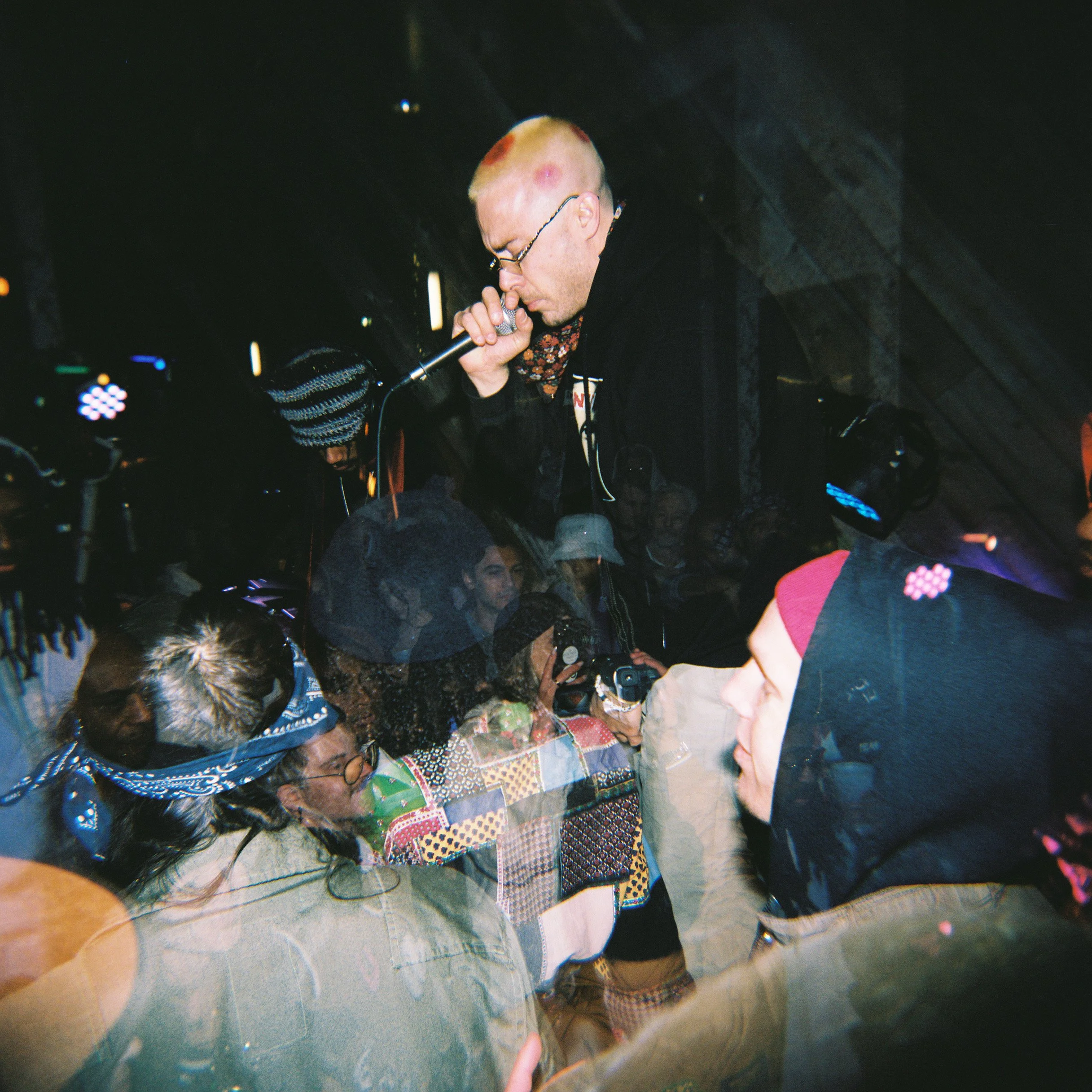Mr. Wattson with glasses and a shaved head holding a microphone and performing at a night event, surrounded by a crowd with some people taking photos. View fullsize
