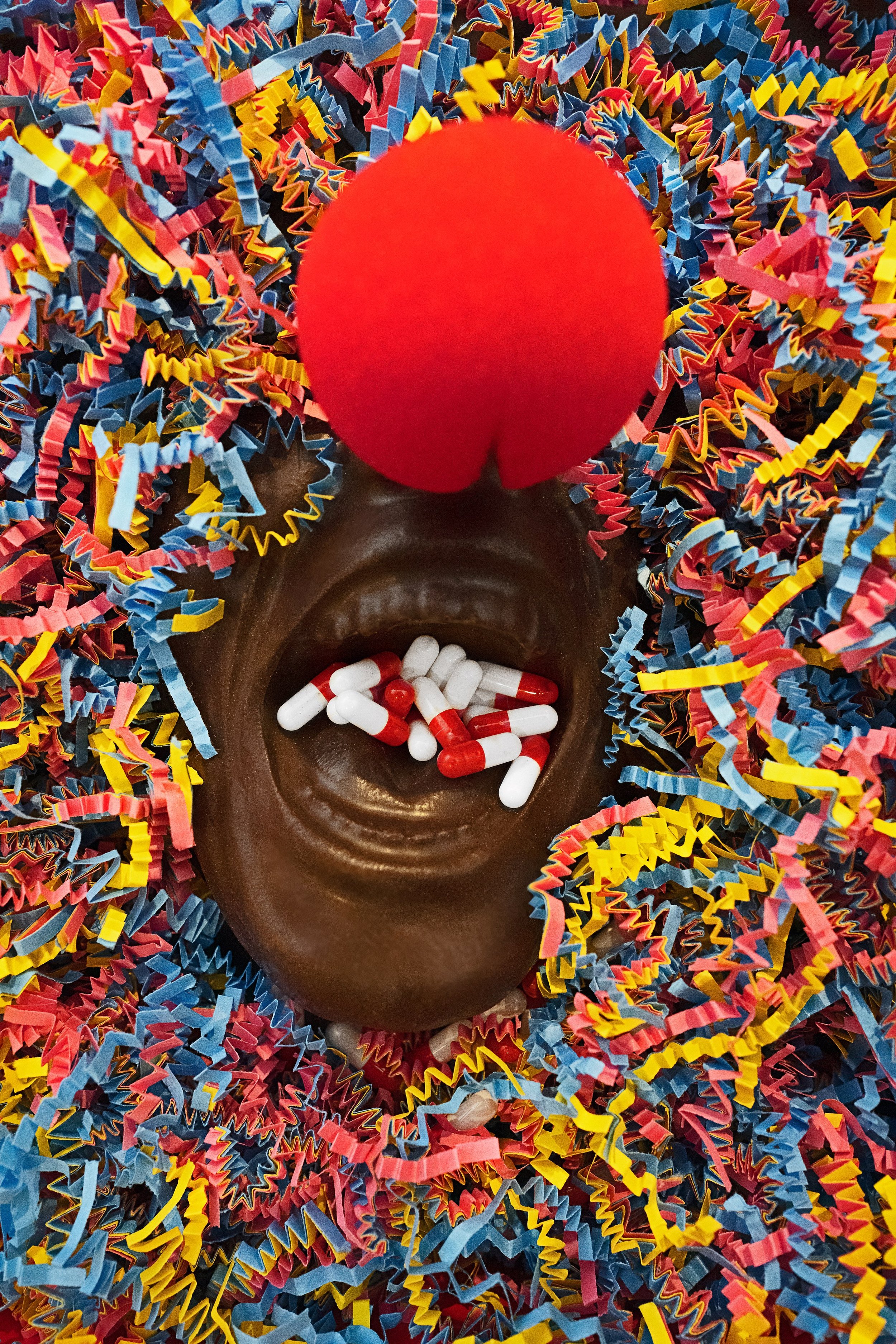 Colorful shredded paper surrounding a chocolate mouth-shaped object with white and red capsules inside, topped with a red clown nose. View fullsize