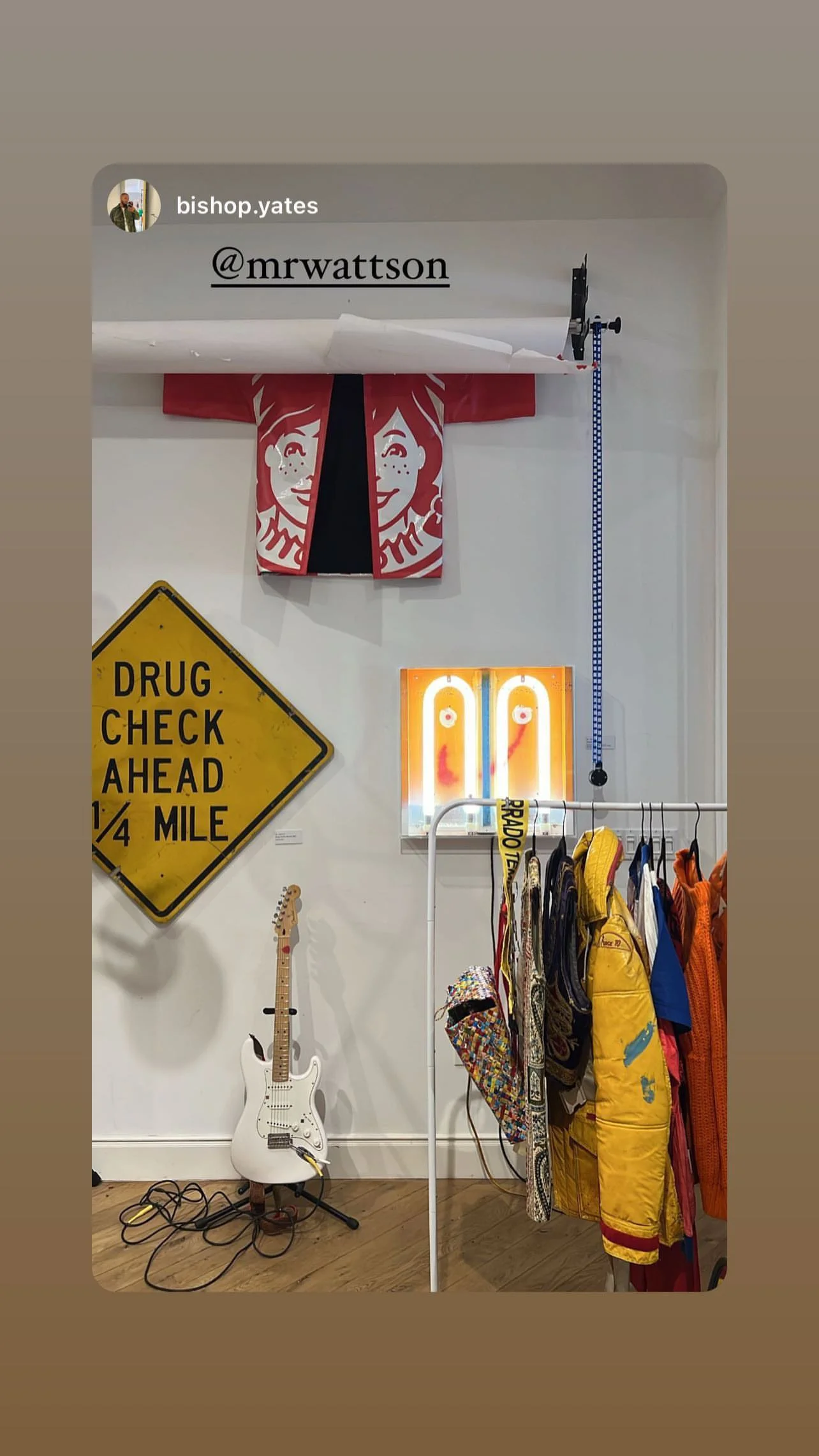 A wall display including a red and white Wendy's uniform shirt, a fluorescent orange art piece with two smiling faces, a white electric guitar, a yellow caution sign that reads 'DRUG CHECK AHEAD 1/4 MILE,' a clothing rack with colorful jackets and ba