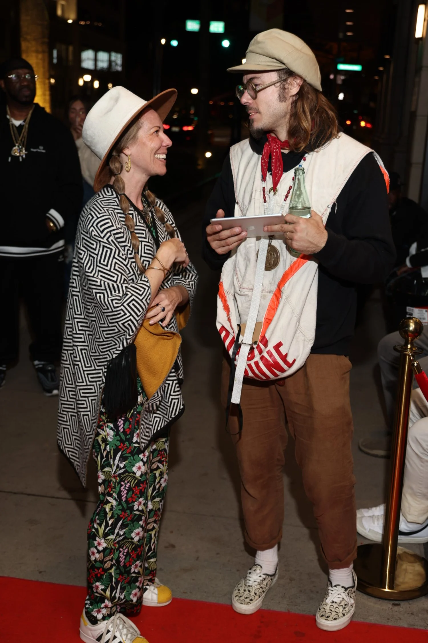 A woman and a man are standing and talking on a city street at night. The woman is smiling and wearing a wide-brimmed hat, patterned blazer, and floral pants. The man has long hair, glasses, a cap, and is dressed in a layered, eclectic outfit with a