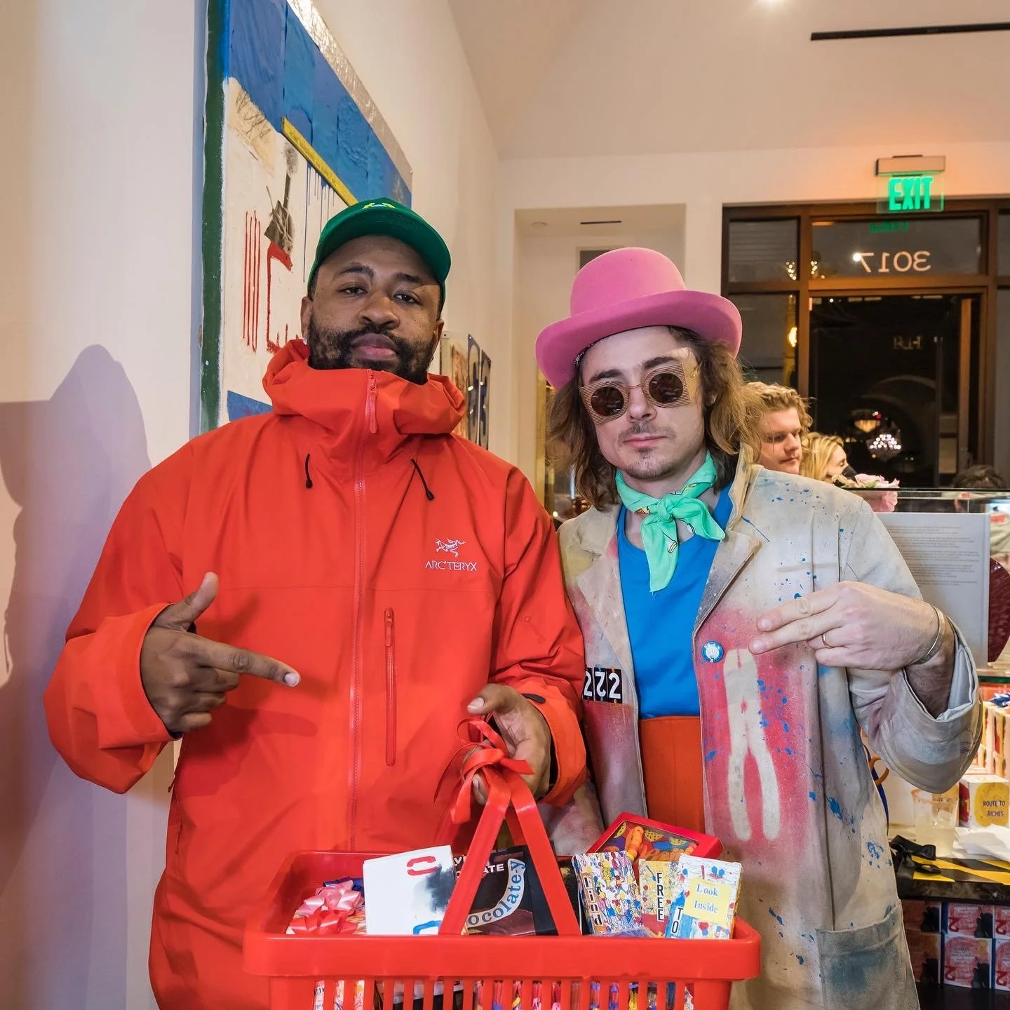 Mike Will Made It and Mr. Wattson posing indoors, Mike wearing a red Arc'teryx jacket and green cap, Wattson dressed as a colorful artist with a pink hat, sunglasses, and a paint-spattered jacket. View fullsize