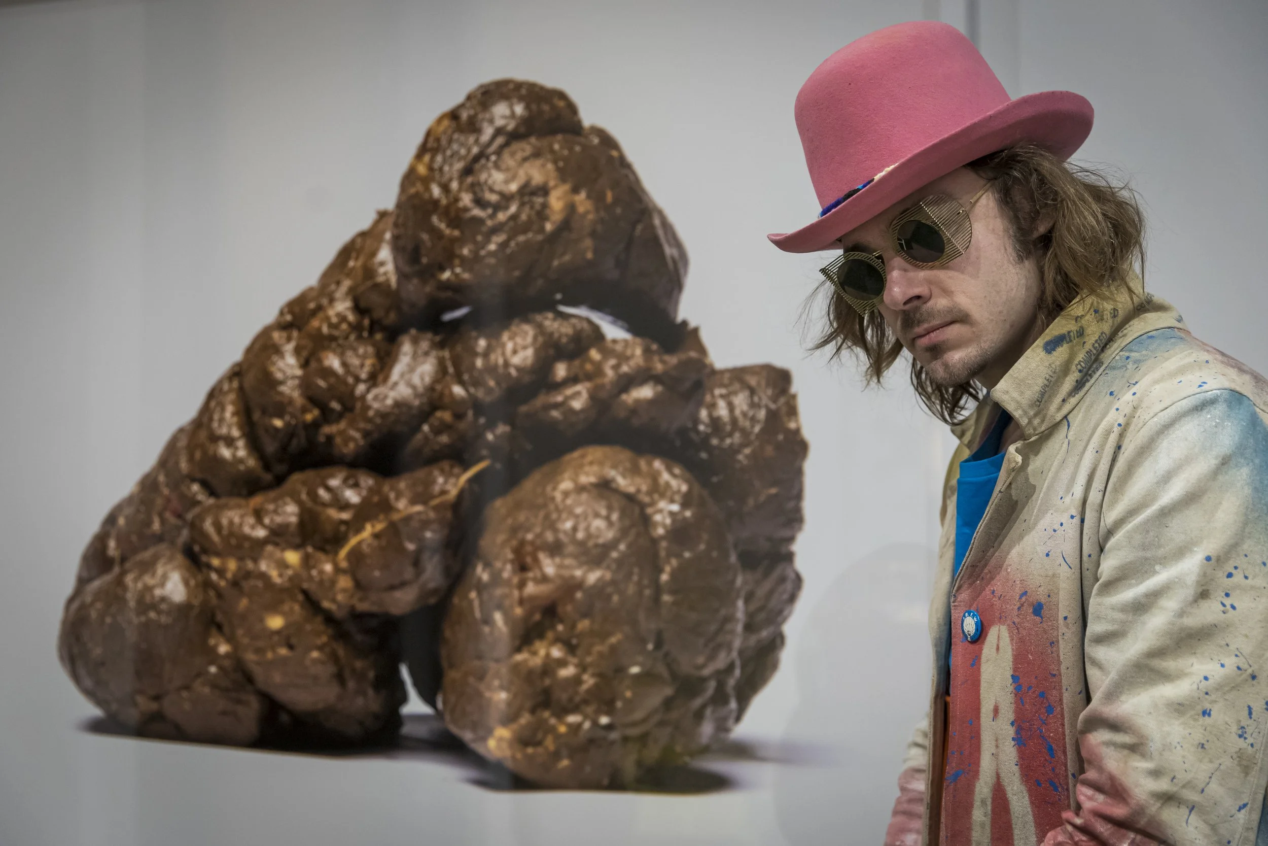 Mr. Wattson with curly hair wearing a pink hat, sunglasses, and a paint-splattered jacket looking at a large pile of chocolate shit, lumpy objects resembling truffles or rocks. View fullsize