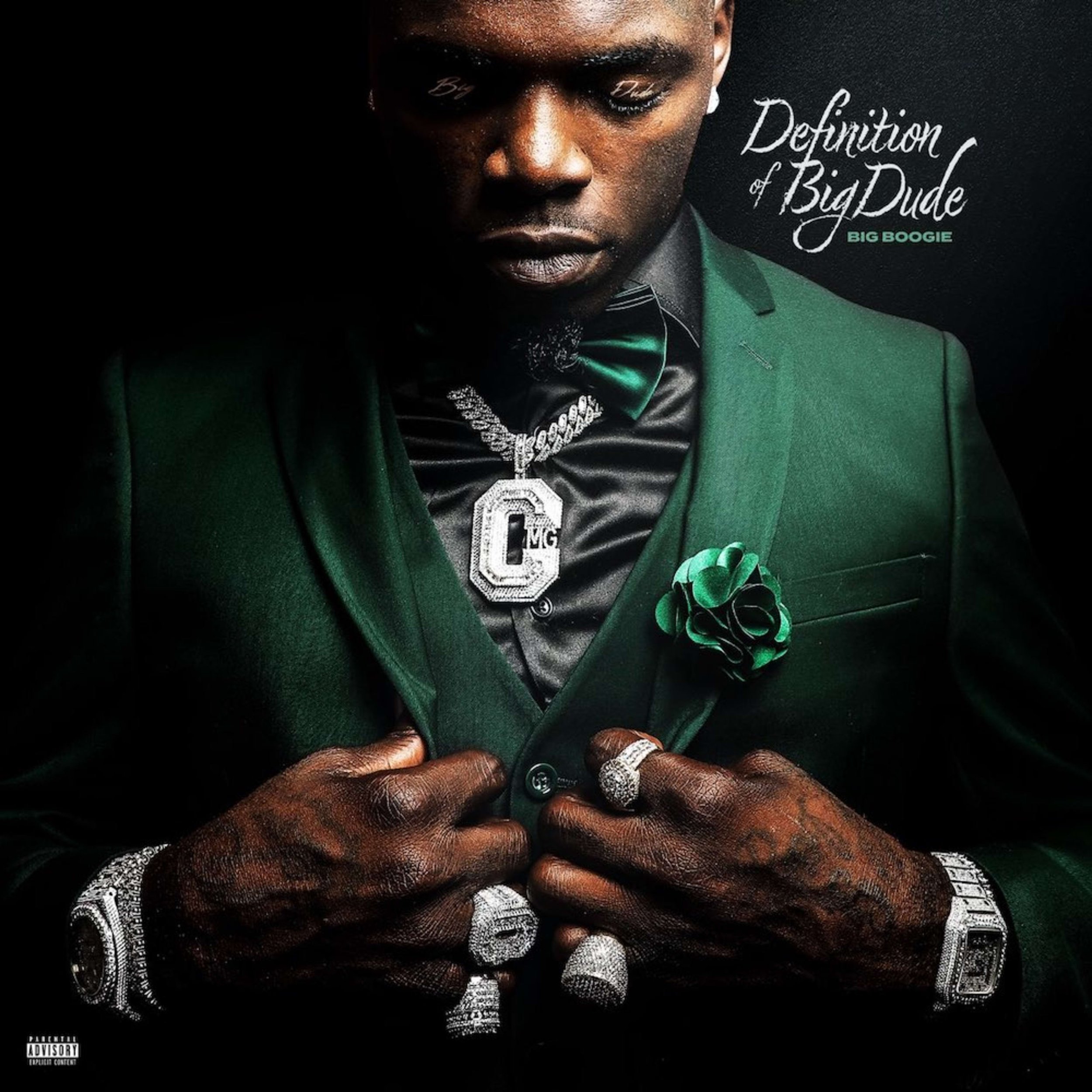 A man dressed in a dark green suit with jewelry, including rings, a necklace, and a watch, is holding the lapels of his jacket. The image is titled "Definition of BigDude by Big Boogie."