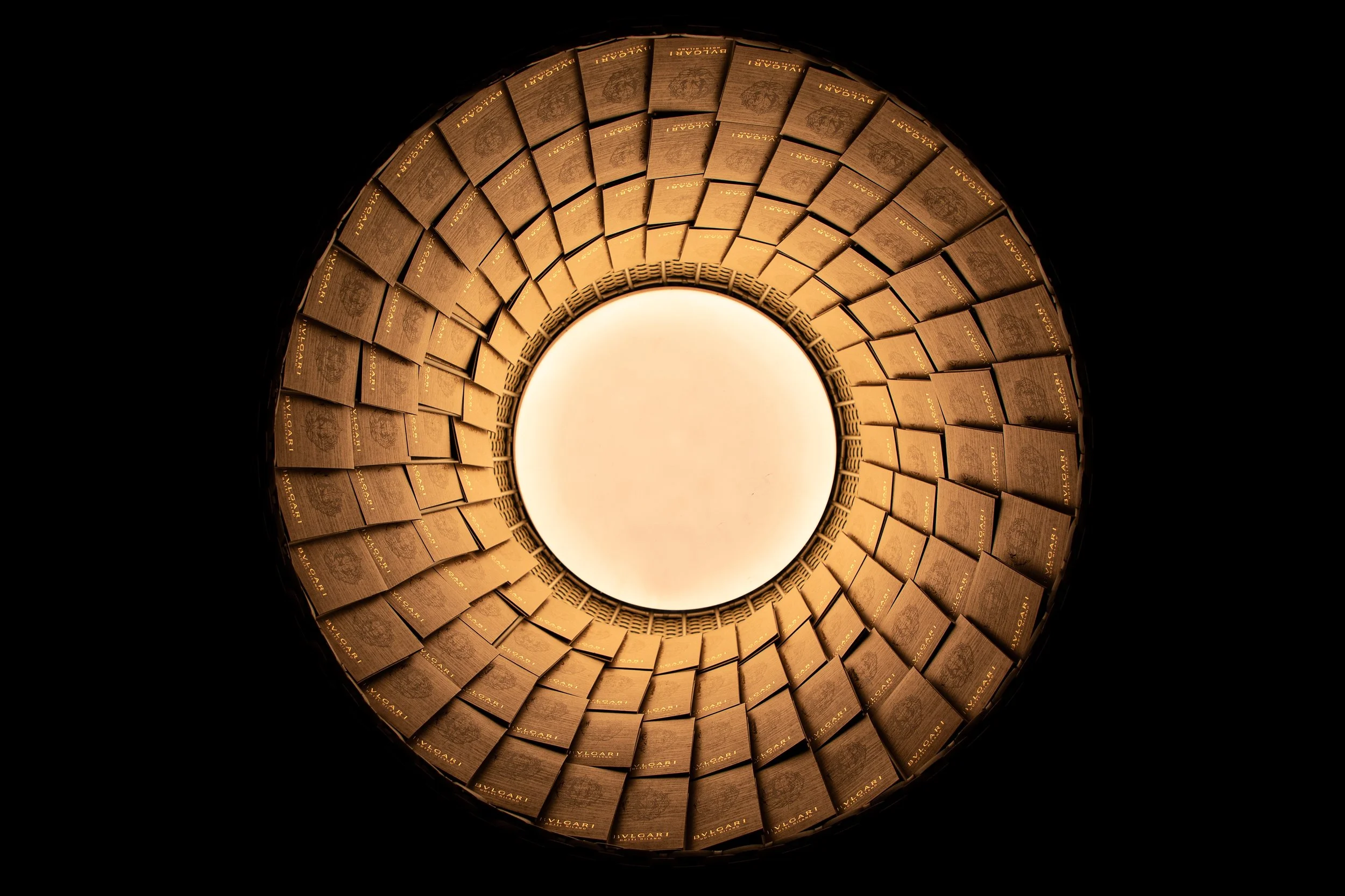 A circular chandelier made of numerous light brown boxes with gold lettering, viewed from below against a dark background.